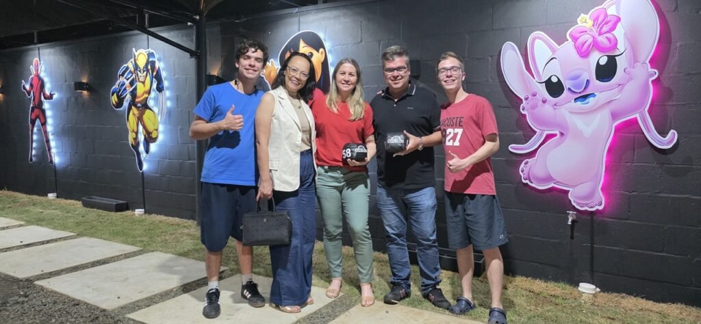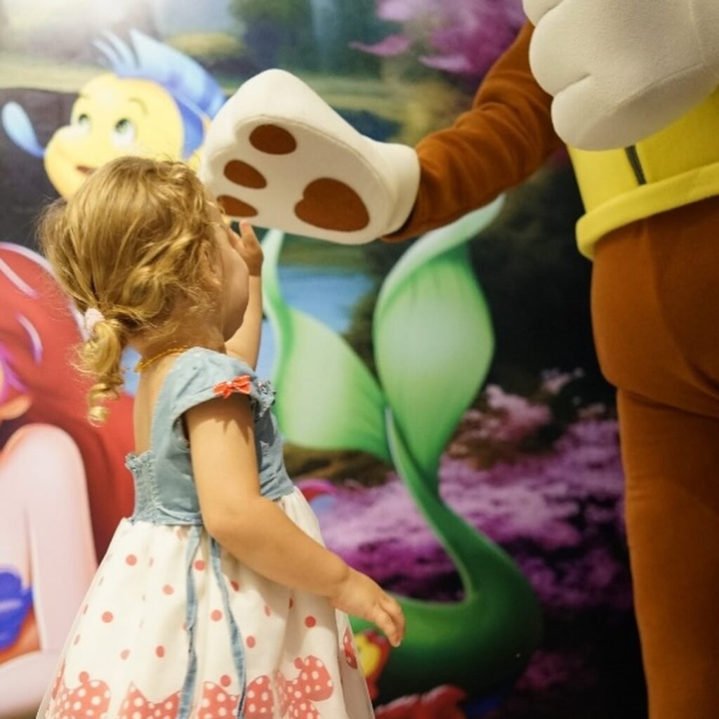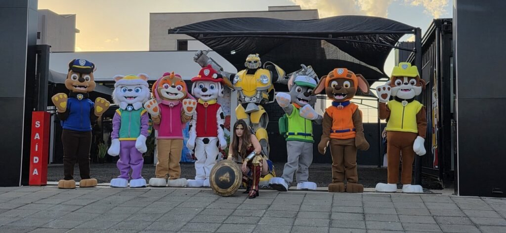 Desde a entrada, a experiência visual é garantida com imagens de heróis, princesas e personagens da atualidade, criando um cenário perfeito para fotos.