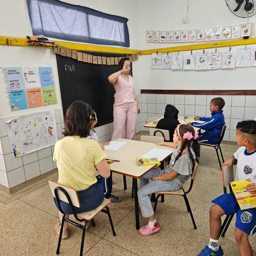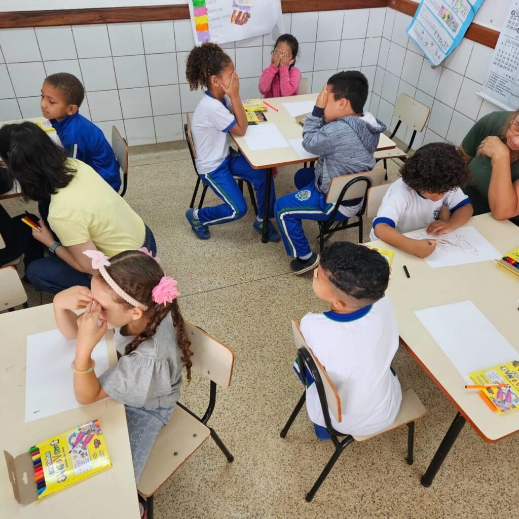 A ação é conduzida por uma psicóloga, que desenvolve dinâmicas e atividades lúdicas com os alunos, permitindo que eles expressem seus sentimentos e percepções de forma espontânea e criativa.