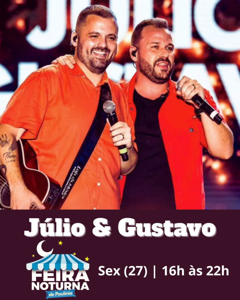 Um dos destaques da noite será o show de Júlio & Gustavo + Banda Mitologia, garantindo animação e repertório variado para o público presente.