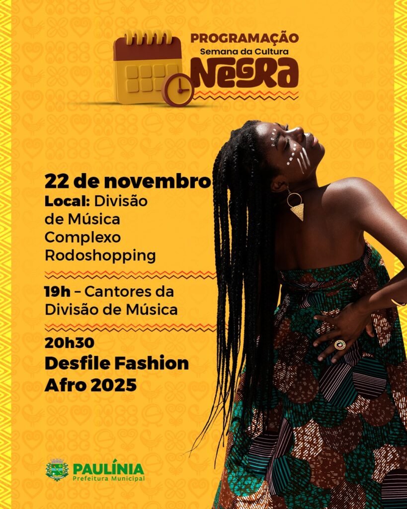 Encerrando as celebrações, no sábado, 22 de novembro, todos os holofotes se voltam para o Desfile Fashion Afro 2025. O evento será realizado na Divisão de Música, localizada no Complexo Rodoshopping. A noite começa às 19h com uma apresentação dos Cantores da Divisão de Música, seguida pelo desfile às 20h30.