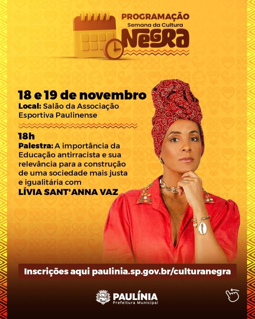 Abrindo as atividades, no dia 18 de novembro (terça-feira), o Salão da Associação Esportiva Paulinense recebe a palestra “A importância da Educação antirracista e sua relevância para a construção de uma sociedade mais justa e igualitária”. O debate será conduzido por Lívia Sant’Anna Vaz a partir das 18h.