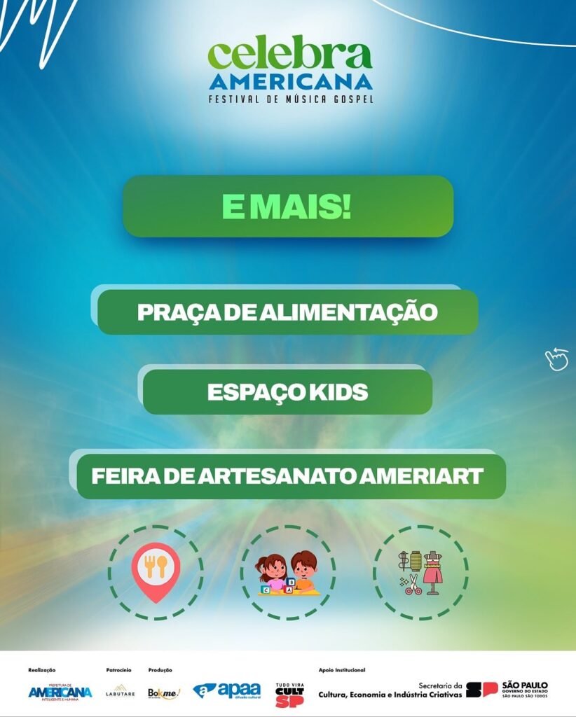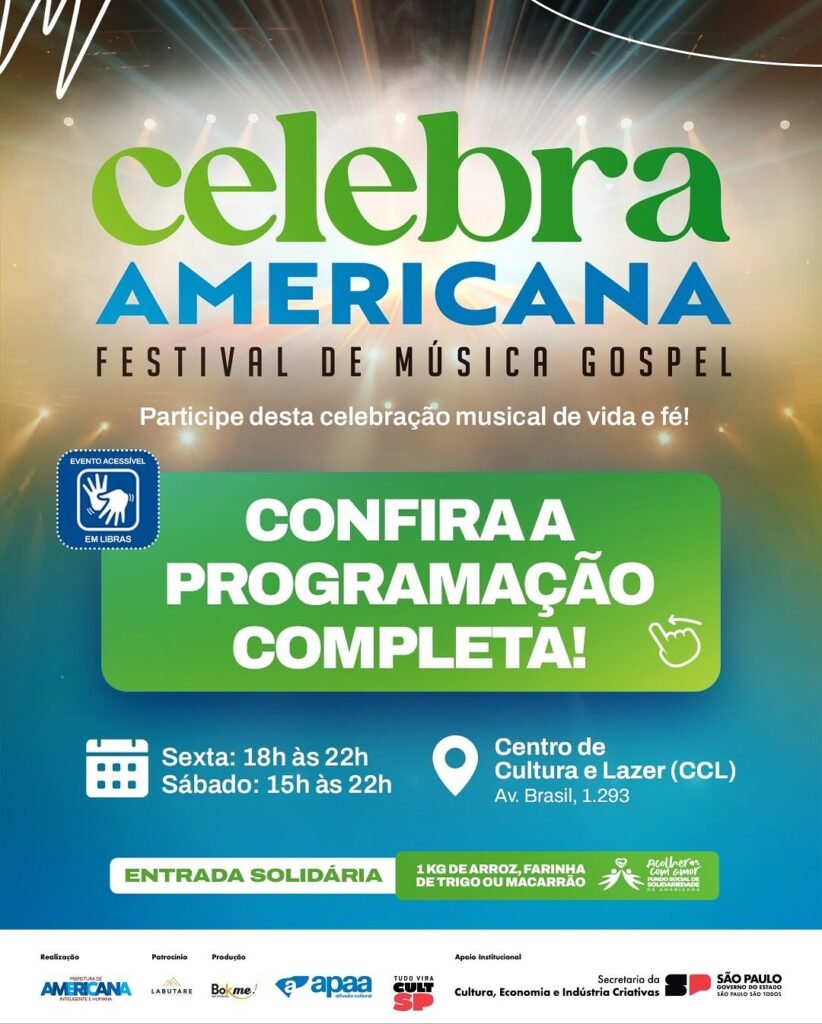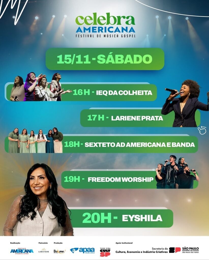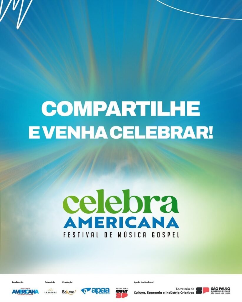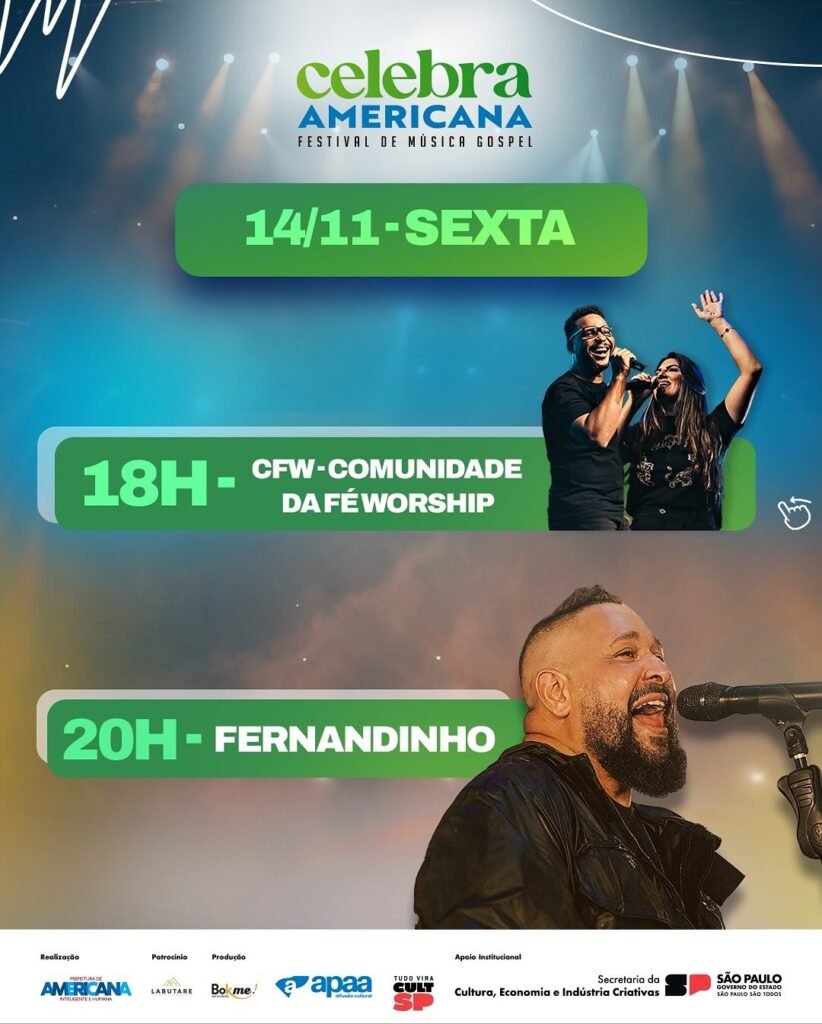 Americana se prepara para um fim de semana de muita música, fé e solidariedade. O Celebra Americana, um grande festival de música gospel, começa hoje (14) e continua amanhã (15), no Centro de Cultura e Lazer (CCL). O evento gratuito traz nomes de peso da música gospel nacional, como Fernandinho e Eyshila, além de valorizar ministérios e artistas locais.